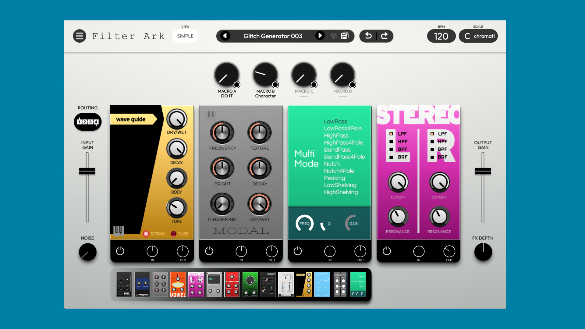Дополнительно есть генератор шума и квантайзер высоты для управления срезом, так что Filter Ark можно использовать и как источник звука для ритмических или мелодических последовательностей. Также доступны четыре макроконтроллера и большой набор готовых пресетов.