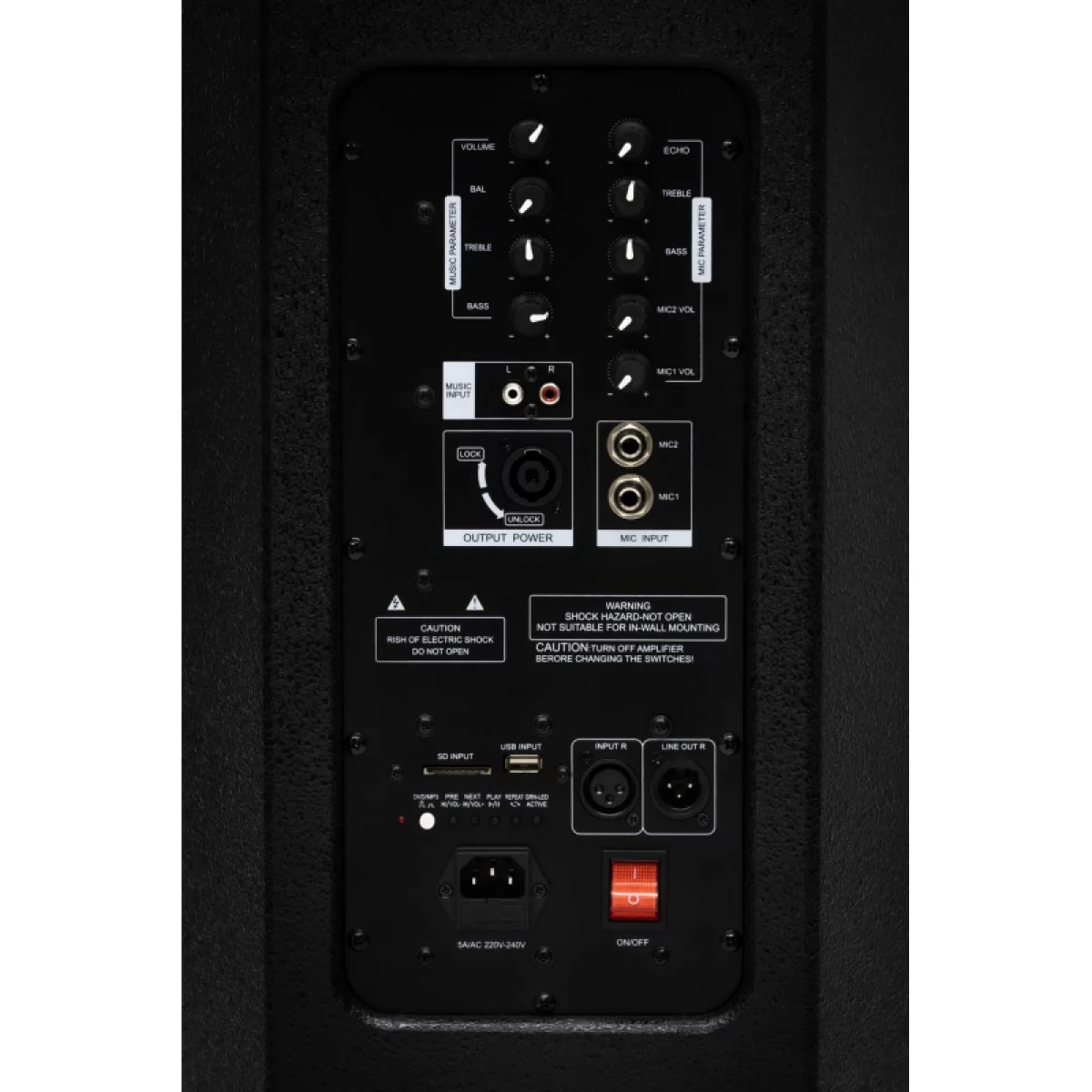 - Входы: 1 x 3-pin XLR in, 2 x RCA music in, 2 x 1/4'' Jack TS mic in