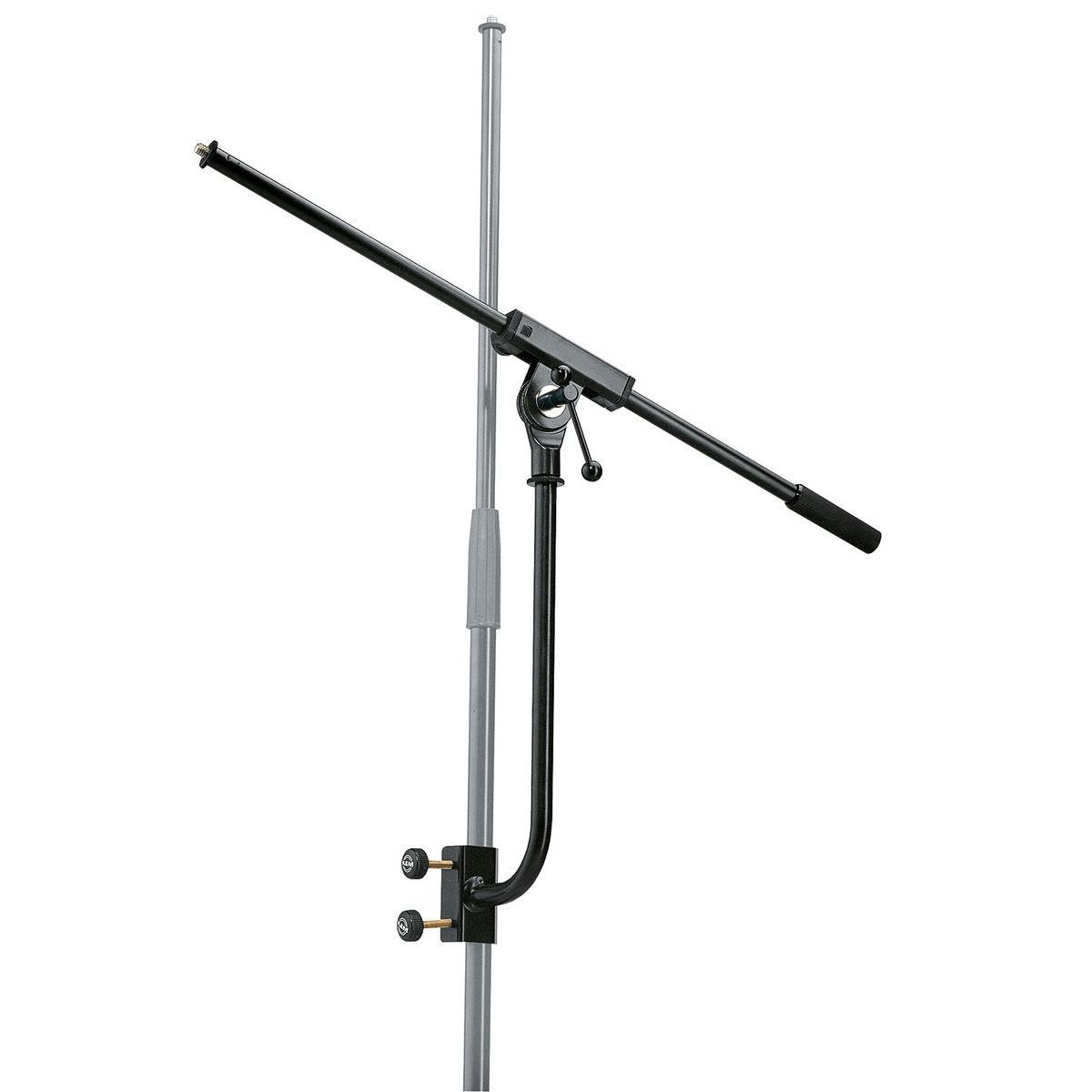 K&M 24010-314-55 - это дополнительный телескопический держатель для микрофона, закрепляемый на микрофонной стойке, который позволяет удобно настраивать высоту и расположение микрофона. Держатель состоит из одной трубки, которая соединена с дополнительным перпендикулярным звеном, которое в свою очередь закрепляется на любых микрофонных стойках диаметром от 15 до 30 миллиметров при помощи стандартных винтов 3/8"". Длина держателя – 60,5 см, высота перпендикулярной трубки – 34 см. Угол наклона и расстояние, на которое выдвигается держатель, настраиваются, после чего он закрепляется при помощи удобного закручивающегося крепления T-bar. Держатель выполнен из прочной стали, при этом имеет он небольшой вес, всего 940 грамм.