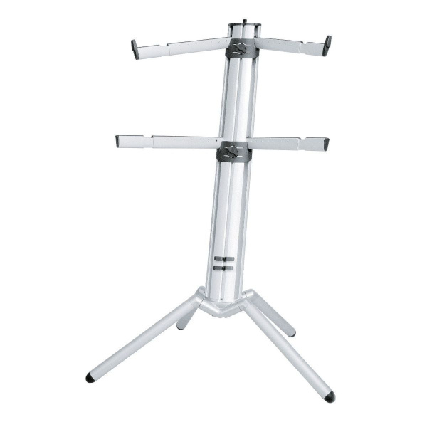K&M 18860-000-30 - профессиональная стойка для клавишных инструментов "Spider Pro". Стойка снабжена двумя парами раздвижных рук, одна из которых расположена под углом 15 градусов. Не может не порадовать функция, которая позволяет теперь добавить еще один уровень для третьих клавишных. У Spider Pro есть 3/8" или 5/8" коннектор для присоединения микрофонной стойки. Угол наклона самой стойки стал намного удобнее, чем был раньше - теперь вам будет удобнее использовать две клавиатуры сразу. Помимо всего прочего новый Spider Pro стал намного эргономичнее и компактнее. Корректировка высоты осуществляется за счет удобных зажимных механизмов подняв полку на нужную высоту надо просто повернуть рычажок. Кроме того стойку удобно хранить и транспортировать она максимально складывается за счет задвигаемых ножек и полок, после чего ее можно убрать в узкий чехол, который продается отдельно.