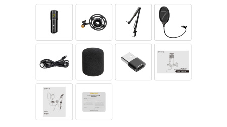 7Ryms SR-AU01-K1 - конденсаторный USB-микрофон c пантографом и поп-фильтром. Комплект отлично подойдет для игр, подкастинга, потокового вещания и т.п. Микрофон имеет кардиоидную диаграмму направленности и цифровой выход, может производить запись с качеством 192 кГц/24 bi и нулевой задержкой мониторинга. Имеется встроенная функция шумоподавления. В комплект входит стойка-пантограф, держатель для микрофона, ветрозащита, поп-фильтр и USB-кабель.