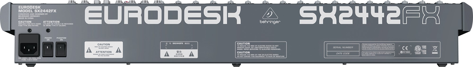 Behringer SX2442FX – профессиональный студийный 24-канальный аналоговый микшер с малошумящими микрофонными предусилителями XENYX. Они позволяют использовать как динамические, так и конденсаторные микрофоны. На входах установлены 3-полосные полупараметрические «британские» эквалайзеры с двумя ручками регулировки нижних частот (помимо верхних и средних), на микрофонных каналах – обрезные НЧ-фильтры 80 Гц. У устройства 4 шины: можно собрать сигналы с одного или нескольких каналов на любую из них. Имеется 2 встроенных процессора эффектов с разрешением 24 бит, оба можно применить к любому каналу независимо друг от друга. Процессоры обладают двумя двухсегментными цифровыми ЖК-дисплеями. Имеется 99 пресетов эффектов, в том числе различные виды реверберации, хоруса, флэнжера, дилэя и других. Также имеется встроенная система обнаружения обратной связи FBQ, которая мгновенно покажет критические частоты. Доступно 4 посыла на каждый канал: два являются пост-фейдерными, а два – переключаемыми пре/пост-фейдерными. Всего на борту находится 16 микрофонных входов XLR с предусилителями XENYX, 16 линейных моновходов, 4 линейных двухканальных стереовхода (8 физических входов) и 2 RCA-входа 2-TRACK. Мастер-выходы представлены разъемами XLR и TRS 1/4" Jack, а также выходом на наушники формата 1/4" TRS Jack и двумя RCA-выходами 2-TRACK: таким образом, вы можете записывать свой сигнал как с RCA-, так и с XLR, и с TRS-выходов. Кроме того, есть 4 выхода суб-групп на 1/4" TRS Jack, а также 2 двухканальных возврата для основных каналов. Помимо этого, в верхней части консоли можно найти 2 FX-посыла и 2 aux-посыла (для talkback-микрофона) на 1/4" TRS Jack и, наконец, 16 обычных инсертов по числу микрофонных каналов и 2 мастер-инсерта, а также вход для внешнего футсвича. У каналов есть собственные регуляторы уровня в виде фейдеров с гейном до +10 дБ, ручки настройки баланса или панорамы, а также уровней воздействия эффектов обоих процессоров с гейном до +15 дБ. В мастер-секции расположен мастер-фейдер, фейдеры 2-TRACK для RCA-выходов, фейдеры выхода наушников/CR и фейдер моно-выхода для подключения сабвуфера. Также имеется функция Talkback.