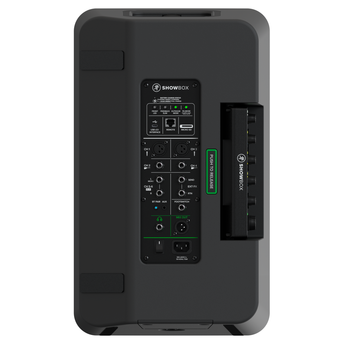 Mackie ShowBox - это универсальная акустическая система, работающая от аккумулятора, со съёмным микшером. Оборудована 8-дюймовым вуфером и 1-дюймовым компрессионным драйвером, мощностью 400 Вт. Система поддерживает Bluetooth для беспроводного подключения и имеет 3-полосный эквалайзер. Покрытие 90° x 60° и несколько режимов голосовой модуляции (Amp/PA, indoor/outdoor). Встроенные лупер и тюнер. Батарея обеспечивает до 12 часов работы. Подключения включают микрофонные входы, эффекты, aux, наушники, микс-выход, USB-C и microSD.