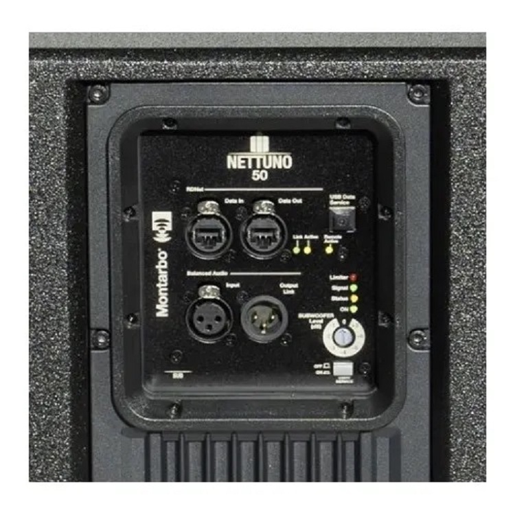 Montarbo Nettuno50 SUB-118S - это активный сабвуфер, являющийся частью флагманской серии Nettuno 50, предназначенной для озвучивания средних и больших площадок. Сабвуфер оснащен 18-дюймовым динамиком с 4-дюймовой звуковой катушкой в конфигурации bass reflex, что обеспечивает глубокие и резонансные басы, дополняющие мощное звучание всей системы. Корпус сабвуфера выполнен из многослойной фанеры с черным покрытием, что обеспечивает прочность и долговечность конструкции. Для удобства транспортировки предусмотрены четыре встроенные ручки (по две с каждой стороны), а также точки крепления для установки топовых модулей. Габариты сабвуфера составляют 850 мм в ширину, 500 мм в высоту и 650 мм в глубину, при весе 45,5 кг. Сабвуфер поддерживает подключение по протоколу RDNet, что позволяет осуществлять удаленное управление и мониторинг системы. Суммарная мощность системы Nettuno 50 достигает 4800 Вт RMS, обеспечивая максимальное звуковое давление до 141 дБ SPL. Система предлагает различные конфигурации для адаптации к любым условиям и стилям выступлений, включая одиночную систему с одним топом и двумя сабвуферами, двойную систему с двумя топами и тремя сабвуферами, подвесную конфигурацию с использованием рым-болтов или установку на стойке только с топом.