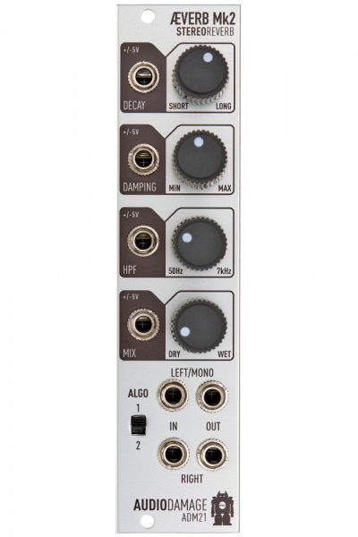 Æverb Mk2 - это цифровой ревербератор с чрезвычайно плотным звуком. Его результаты довольно нереалистичны, но очень атмосферны. Пользователь может выбирать между двумя алгоритмами реверберации. Все параметры эффекта содержат входы CV. Два аудиовхода и выходов делают Æverb Mk2 настоящим стереопроцессором.