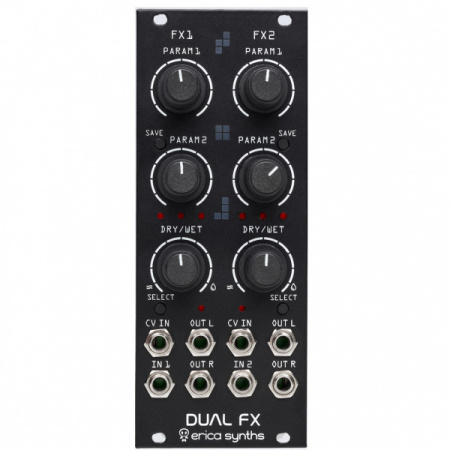 Erica Synths Dual FX - Eurorack-модуль эффектов, отлично подойдет, чтобы добавить пространства вашим композициям. Модуль предлагает два идентичных раздела из 8 пользовательских эффектов: Mono delay, Stereo delay, Hi-pass delay, Big reverb, Saturated reverb, Stalker reverb, Ripper и Dual pitch shifter. Все эффекты снабжены двумя регулируемыми и управляемыми CV параметрами. Dual FX объединяет в одном модуле две микросхемы Spin FV-1, каждая из которых заполнена восемью программами с индивидуальными эффектами с двумя регулируемыми параметрами и параметрами CV и dry/wet для каждого эффекта. Все настройки параметров могут быть сохранены и мгновенно вызваны во время исполнения. Также вывод первой секции FX нормализуется ко второму вводу, что позволяет легко создавать слои эффектов.