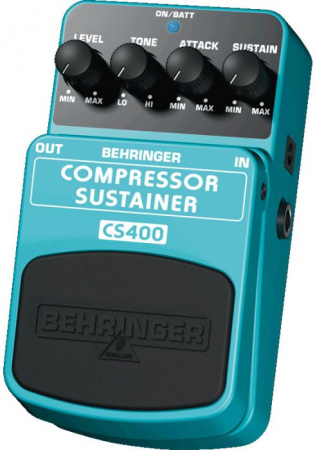 Behringer CS400 - педаль эффектов динамической обработки компрессор/сустейнер. Педаль ослабляет громкие и поднимает тихие сигналы, не изменяя при этом характера тембра. Для настройки предусмотрены регуляторы уровня, тона, атаки и сустейна. Доступно чистое прохождение сигнала в режиме обхода благодаря первоклассному электронному выключателю. Имеется голубой светодиодный индикатор работы эффекта и проверки батареи. Питание осуществляется от батареи 9 В или сетевого адаптера Behringer PSU-SB (в комплект поставки не входит).