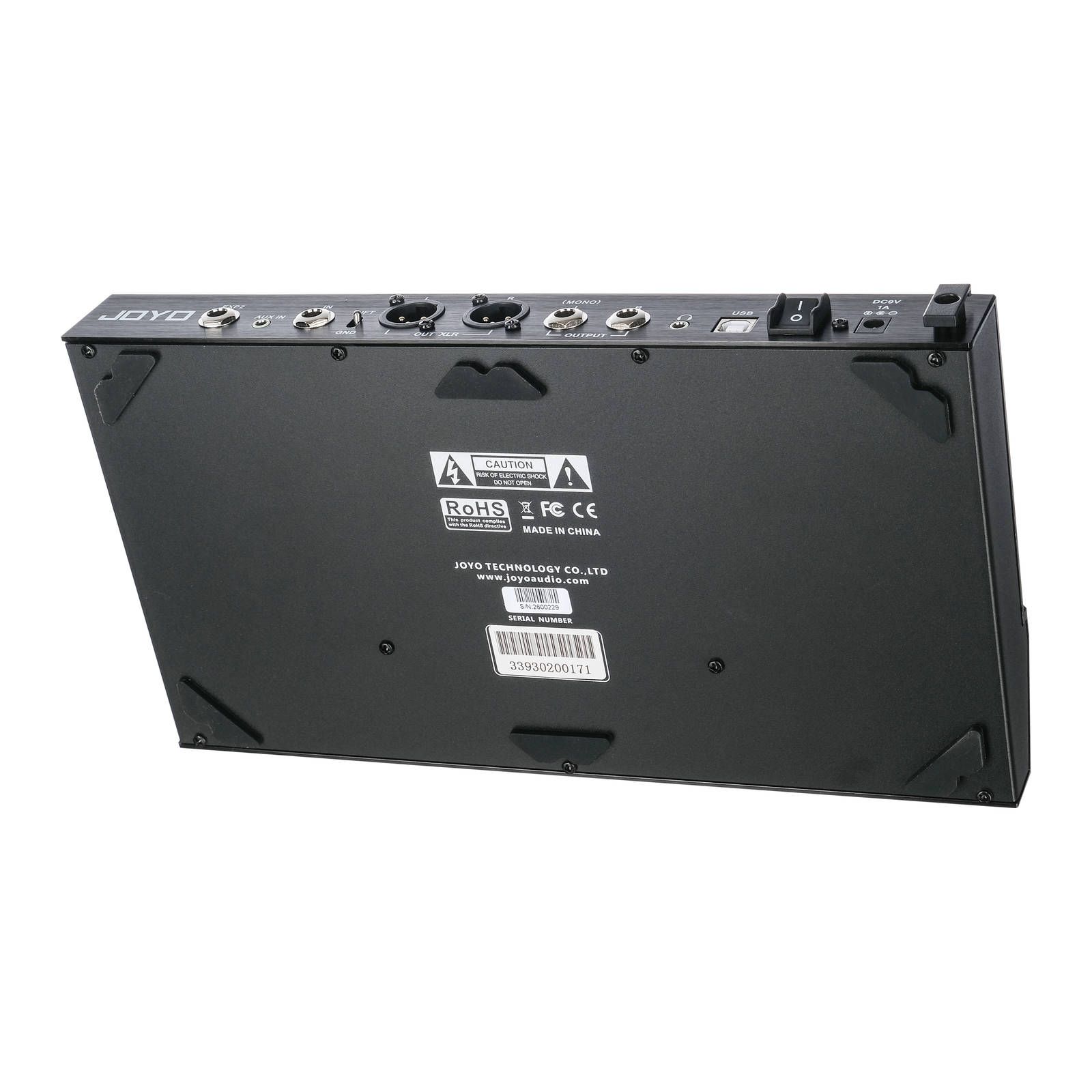 - Задняя панель: EXP2 на стереоджеке 1/4 дюйма (требуется стереокабель) для педали экспрессии, вход Aux на мини-стереоджеке 1/8 дюйма (10 кОм) для смартфона или MP3-плеера, вход на моноджеке 1/4 дюйма (1 МОм) для гитары, переключатель Grn/Lift, 2 выхода XLR (левый и правый, 1 кОм) для микшера, 2 выхода на моноджеках 1/4 дюйма (левый и правый, 510 Ом) для усилителя и микшера, выход для наушников на мини-стереоджеке 1/8 дюйма (32 Ом), порт USB-B для ПК, переключатель питания, разъем питания 9 В постоянного тока, 1 А (минус в центре)