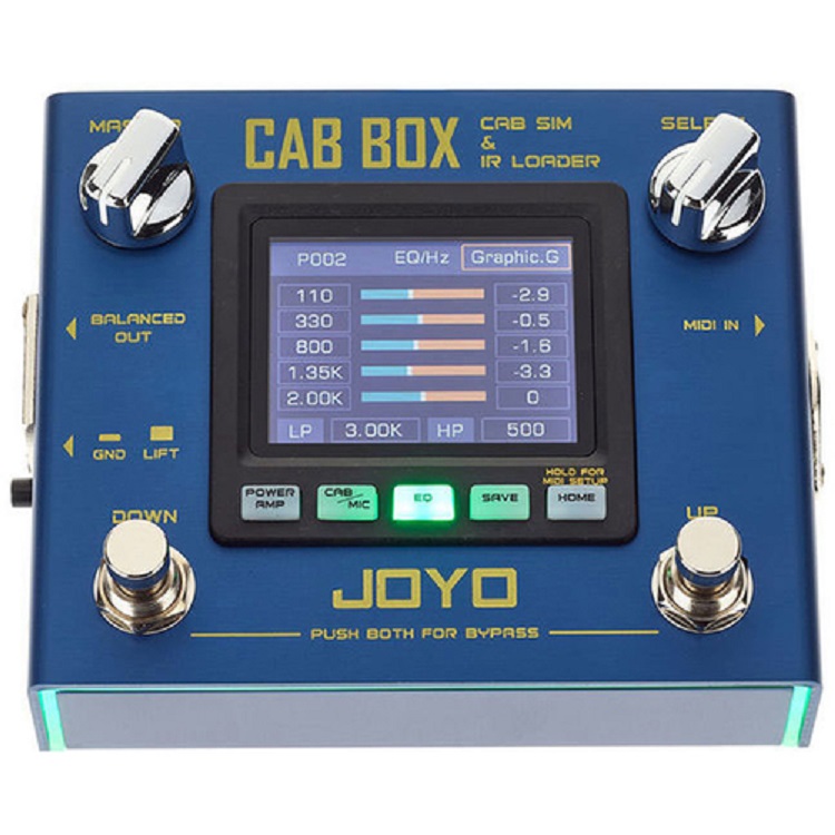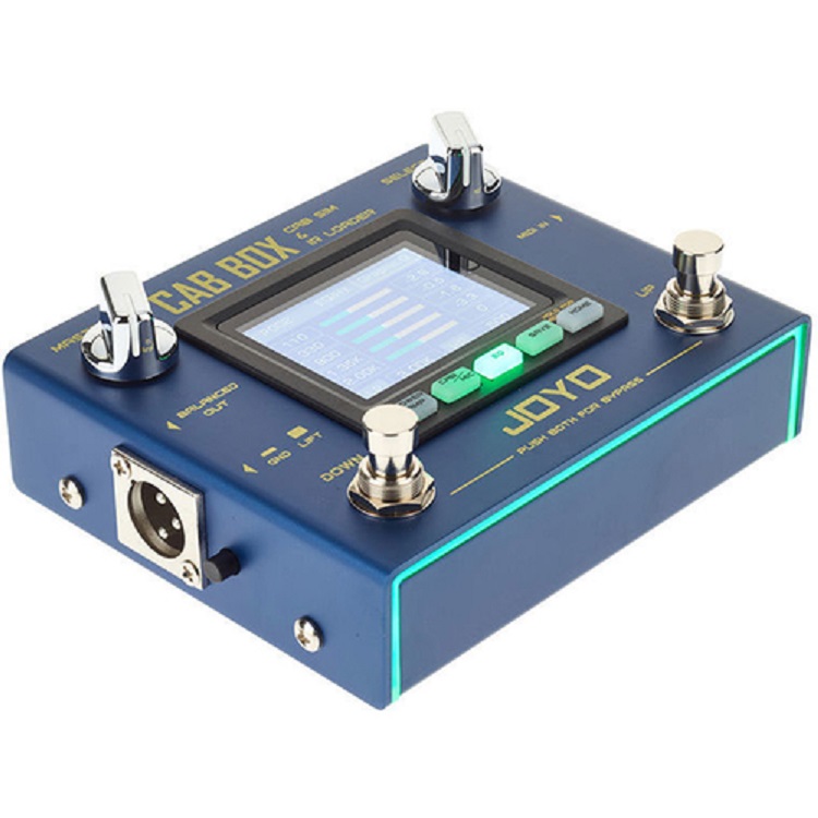 Joyo R-08 Cab-Box - педаль эмулятор гитарного кабинета с поддержкой загрузки IR-импульсов. Она имеет эмуляции четырех ламп (6L6, 6V6, EL34 и EL84), 20 моделей кабинетов и 11 классических моделей микрофонов. Что касается IR-импульсов, то их предустановлено 20. Также есть 10 банков для сторонних IR-импульсов. Можно подключиться через порт микро USB к компьютеру и, используя соответствующие программы, редактировать тона и обновлять прошивку, загружать и удалять сторонние IR-импульсы. Педаль имеет удобный интерфейс управления с крупным экраном и пятью кнопками управления. Также на фронтальной панели находятся регуляторы общей громкости и выбора, футсвичи Down и Up, на боковой – переключатель Grn Lift и на задней – переключатель светодиодной подсветки Sync/Always/Off. Разъемы включают вход, Thru и выход на моноджеках 1/4 дюйма, выход на мини-стереоджеке 3,5 мм для наушников, балансные вход и выход XLR, порт микро USB и разъем питания DC 9 В.