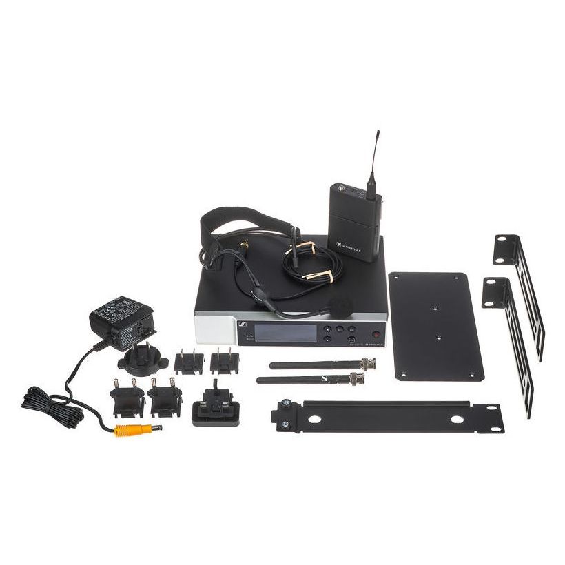 - В комплекте: приемник EW-D EM, передатчик EW-D SK, конденсаторный головной микрофон ME 3-II, 2 антенны, адаптер питания с международными переходниками, крепеж для стойки, батареи AA
