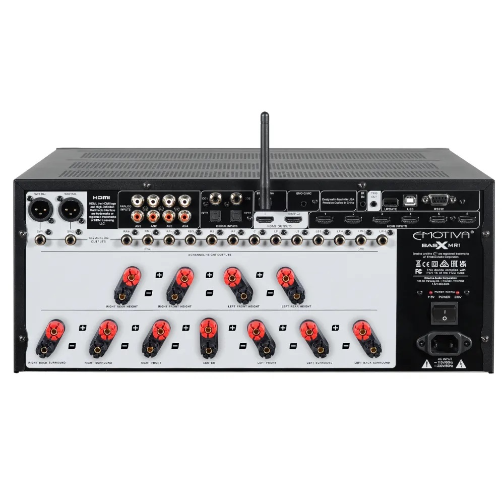 Emotiva MR-1 - многоканальный киноресивер с поддержкой Dolby Atmos и DTS:X. Киноресивер BasX MR1 сочетает в себе высокопроизводительный 13,2-канальный процессор объемного звука и 11-канальный усилитель мощности аудиофильского качества в одном шасси. Раскройте свои истинные возможности иммерсивной системы объемного звучания благодаря лучшей в своем классе мощности, запасу мощности и эффективности. Секция усилителя BasX MR1 объединяет 11 каналов сильноточного дискретного усиления мощности аудиофильского класса класса A/B. Используя сложный источник питания класса H, управляемый массивным тороидальным силовым трансформатором мощностью 1000 ВА, MR1 обеспечивает непревзойденную эффективность. Настоящий несжатый многоканальный объемный звук через eARC обеспечивает бескомпромиссную игровую производительность и простоту подключения. Силовой трансформатор Emotiva MR-1 мощностью 1000 Вт. Он питает блок питания Soft Switch класса H, обеспечивающий высокую эффективность, холодную работу и надежную работу.  Emotiva MR-1 оснащен 6 видеовходами HDMI 2.0b, каждый из которых поддерживает видеоформаты 4K UHD HDR, включая eARC. Мощные аналоговые устройства SHARC DSP поддерживают новейшие форматы Dolby Atmos, Dolby Surround, DTS, DTS:X, DTS Neural X и другие популярные режимы. MR1 имеет возможность настроить ваше устройство в соответствии с требованиями вашей комнаты. Независимо от того, используете ли вы специальную систему 2.1, традиционную систему объемного звучания 7.1 или систему Atmos 7.2.4 или 5.2.4 или DTS:X. Обработка доступна до 13,2 каналов с дополнительным 2-канальным усилителем. Прямой доступ ко всем входам, включая выбор выходов HDMI. Настраивайте на лету с помощью эксклюзивной функции Live Trim для всех основных групп динамиков: сабвуфера, центра, верхних АС и колонок объемного звучания.