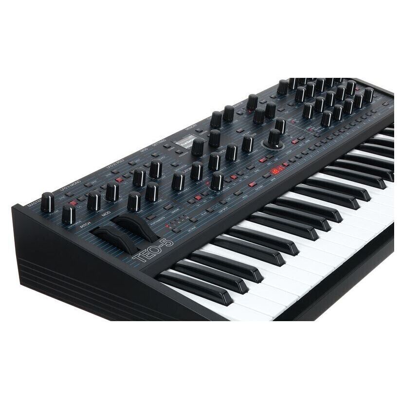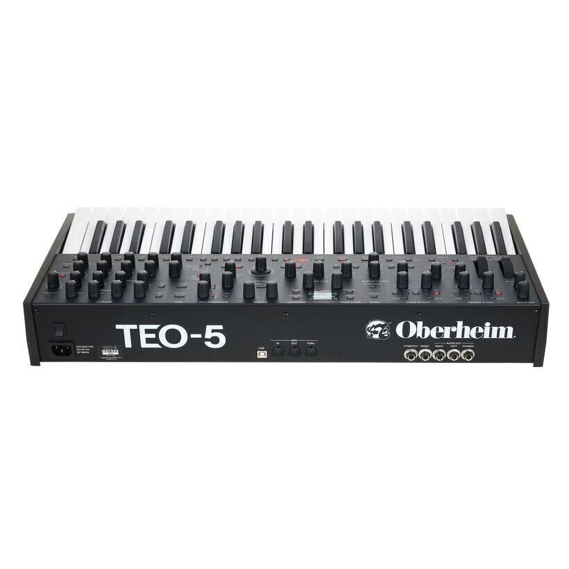 Oberheim TEO-5 - 5-голосный полифонический аналоговый синтезатор с двумя VCO и сабосциллятором на каждый голос. Каждый осциллятор предлагает треугольную, пилообразную и переменную прямоугольную формы волн, а также возможность модуляции hard sync и X-Mod с FM. На борту также предусмотрены классический фильтр SEM с двумя режимами работы, две огибающие DADSR, два LFO с пятью формами волн и синхронизацией по темпу. "Vintage" регулятор добавляет вариации в поведении компонентов для имитации винтажного звучания. Встроены арпеджиатор, 64-шаговый полифонический секвенсор и мультиэффекты, включая реверберацию, задержку, хорус, фленджер и фазер. Клавиатура Fatar на 44 полувзвешенные клавиши с чувствительностью к скорости и каналом aftertouch. 256 заводских и 256 пользовательских пресетов. Интегрированный блок питания.