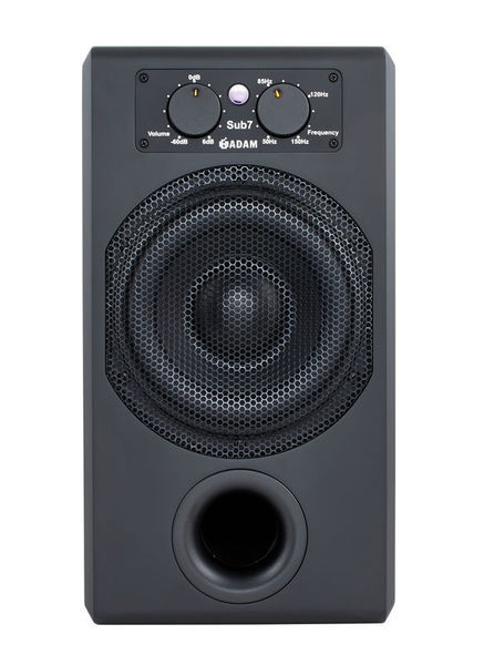 Adam Sub7 - активный 7" студийный сабвуфер среднего уровня. В основе сабвуфера лежит специально разработанный низкочастотный излучатель диаметром 7” с конусом из мелованной бумаги. Под ним расположен большой фазоинвертор, который помогает нижним частотам стать еще более плотными. Основные ручки регулировки находятся на фронтальной панели (это регулятор громкости от -60 дБ до +6 дБ и ручка бесступенчатого выбора позиции НЧ-фильтра в диапазоне от 50 до 150 Гц). Между ними можно увидеть ИК-приемник, а в комплекте находится пульт ДУ, которым также можно регулировать громкость и частоты. Максимальная выходная мощность встроенного усилителя составляет 140 Вт RMS. Он специально создавался для дополнения мониторов серии A5 и A7. Основным отличием является компактный размер и три варианта расцветки. На передней панели расположены контроллеры для управления входным сигналом и частотой разделения каналов, что позволяет настроить его для любой ситуации. Сабвуфер оснащен небалансными RCA разъемами (входные и выходные) и балансными XLR. Несмотря на свою компактность, сабвуфер способен выдавать богатые и насыщенные басы в составе любых аудиосистем.