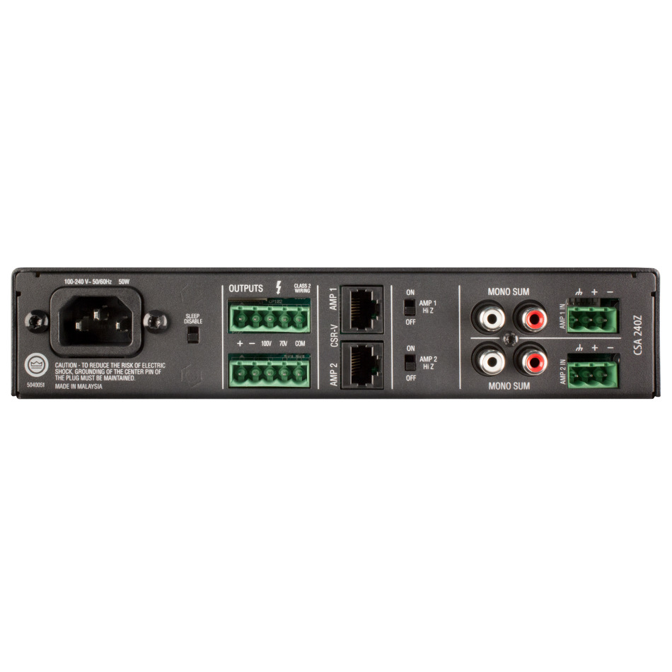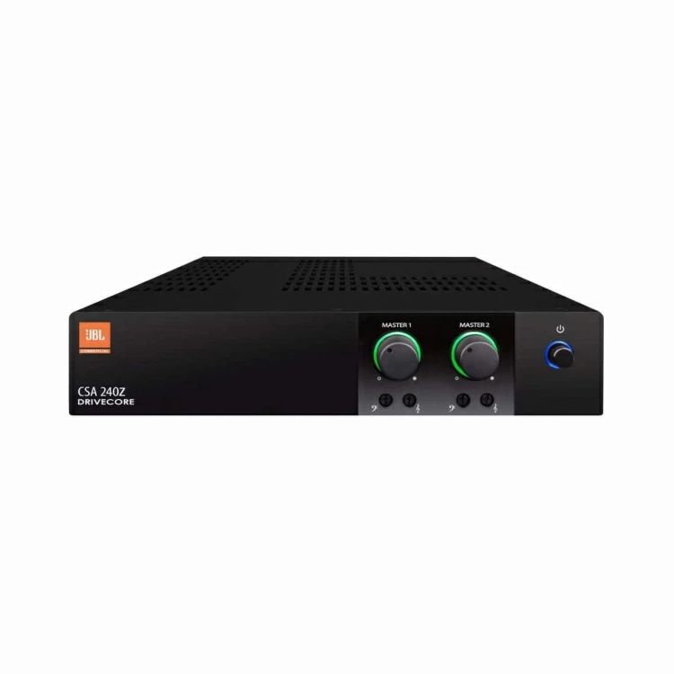 JBL CSA240Z - трансляционный двухканальный усилитель в рэковом корпусе серии JBL Pro Commercial Series Amplifiers (CSA). Может работать как с низкоомной (4-8 Ом) акустикой, так и в трансляционных линиях 70/100В. Встроенный усилитель базируется на моделях серии DriveCore. Усилитель обеспечивает мощность до 40 Вт/канал. Выходы выполнены на пятиконтактных колодках Euroblock, входы – на трехконтактных Euroblock, есть дополнительные стереовходы RCA для бытовых источников. Встроены двухполосные эквалайзеры с закрытыми средствами настройки на фронтальной панели. Там же находятся ручки регулировки мастер-уровня для каждого из каналов, подсвеченные светодиодными кольцами зеленого цвета, и кнопка включения со светодиодным кольцом синего цвета. Имеется режим автоотключения при неактивности. Универсальный блок питания работает при напряжении от 100 до 240 Вольт. На тыловой панели расположены разъемы RJ45 для использования с настенными контроллерами громкости JBL Pro CSR-V.