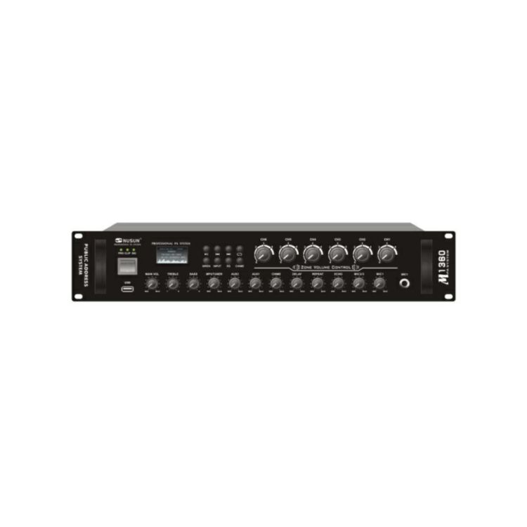 M1360 - трансляционный микшер-усилитель с MP-3 плеером и функцией тюнера FM. - Мощность 360 Вт. - 6 зон с раздельной регулировкой уровня. - Режим работы - 70/100 В, 8 Ом. - Поддержка MP-3 и WMA формата. - Тюнер FM. - Функция перезвона и сирен - 2 AUX -входа, 3 MIC -входа, 1 AUX-выход - Функция приоритета на MIC1. - LED дисплей с индикацией. - Индивидуальный контроль для микрофонного и AUX входов. - Регулировка тембров. - Питание 220 В/50 Гц. - Потребляемая мощность - 400 Вт - Вес -16 кг. - Габариты 482 х 410 х 88 мм.