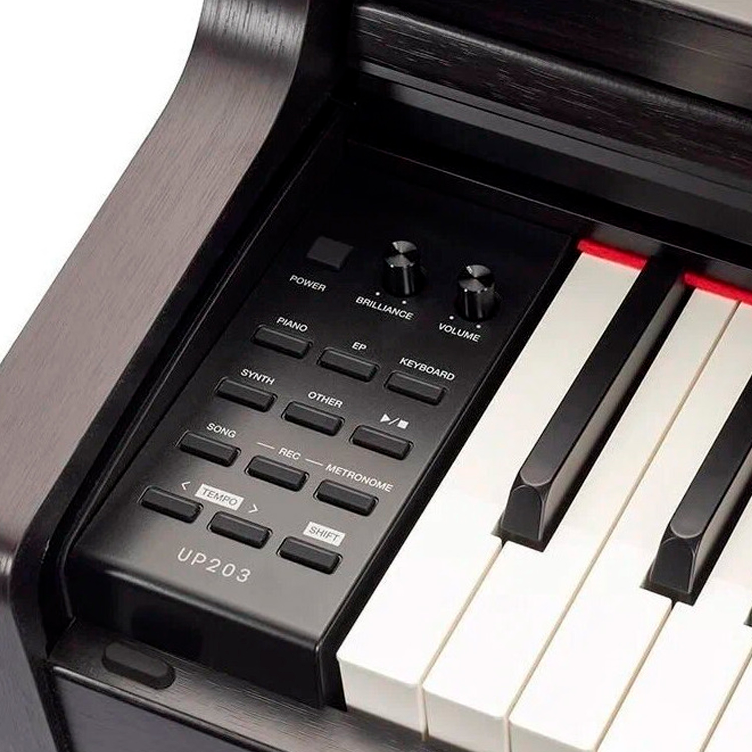 Medeli UP203 - многофункциональное цифровое пианино. UP203 – новая модель которая всесторонне отличается как внешним видом, так и ощущением от игры. Электропиано оснащено новыми тембрами Japanese Grand, редактируемыми параметрами звука фортепиано, такими как шум молоточка или резонанс струн, оригинальной совместимостью с приложением PianoToolbox и новым педальным блоком, поддерживающим полупедальное демпфирование – все это делает его лучшим выбором для музыкальных композиций.