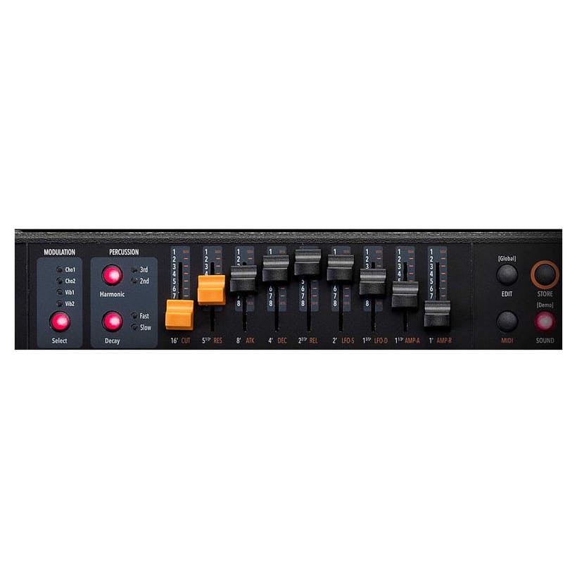 • Дисплей OLED 128×64 точек, энкодер, 7 регуляторов, 20 кнопок, stick-контроллеры питч, модуляции и FX.